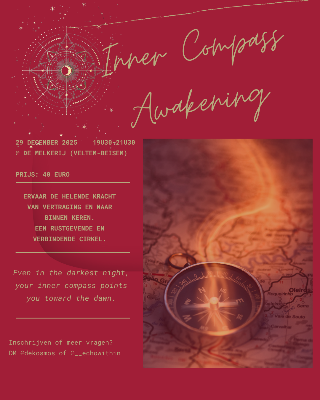 Wees welkom in De Melkerij (Veltem-Beisem) van 19u30 tot 22u (het kan zijn dat we wat later eindigen) op maandag 29 december voor onze Inner Compass Awakening.